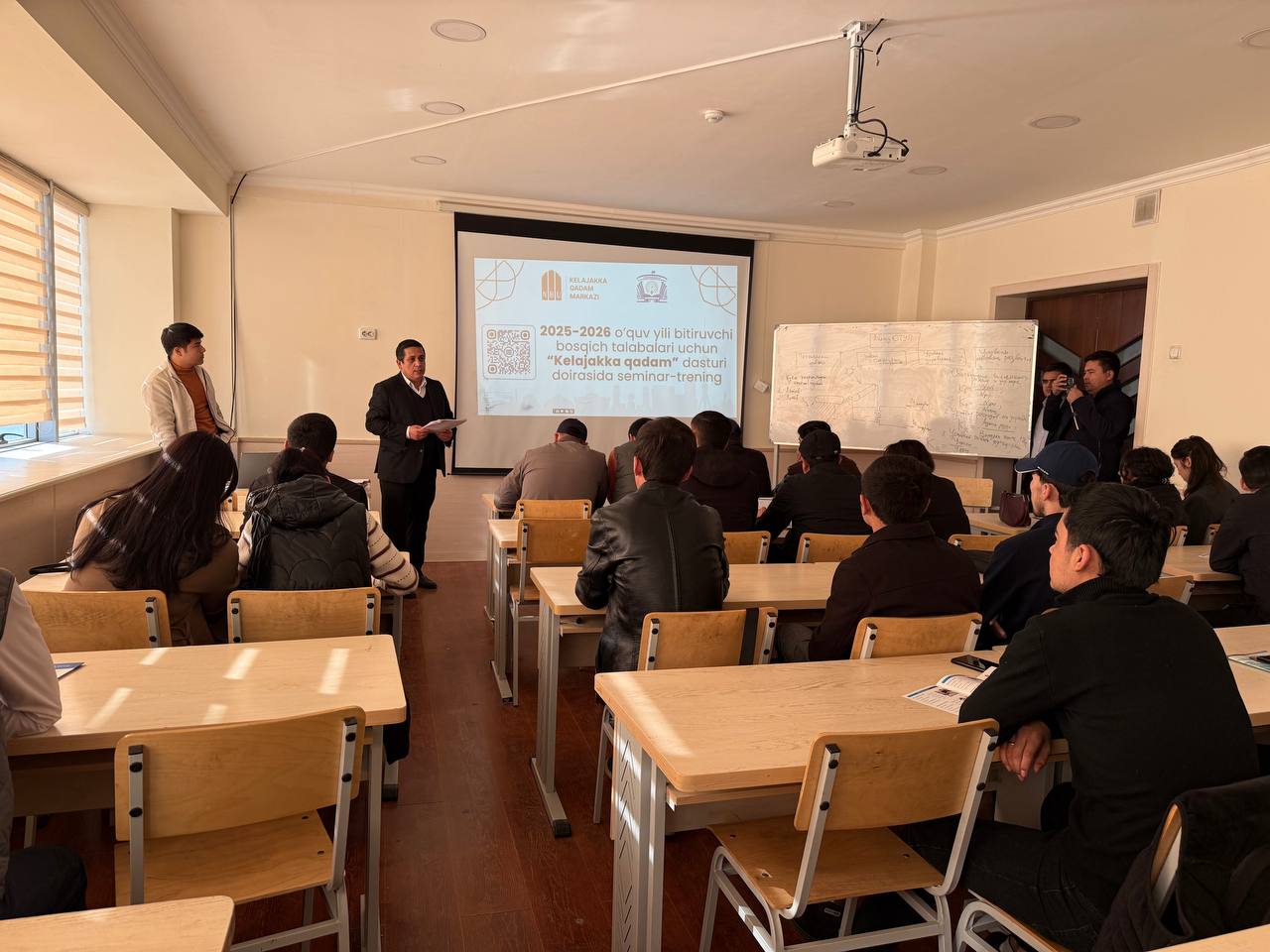 O‘zbekiston Respublikasi Prezidentining 2025-yil 14-fevraldagi “Oliy ta’lim tashkilotlari bitiruvchilarining ishga joylashishiga ko‘maklashish bo‘yicha qo‘shimcha chora-tadbirlar to‘g‘risida”gi 61-son qaroriga asosan, oliy ta’lim muassasalari bitiruvchilarining mehnat bozoriga integratsiyasini kuchaytirish, xususiy sektor va tijorat banklari ishtirokida kadrlar tayyorlash jarayonini takomillashtirish maqsadida universitetida tashkil etilgan "Kelajakka qadam" markaziga biriktirilgan “O‘zmilliybank” AJ Samarqand viloyat filiali kridit bo‘limi boshlig‘i Shermuhammad G‘aniyev hamda Temurbek Tirkashevlar, universitet o‘quv ishlari bo‘yicha prorektor Mirolim Shodmonqulovlar bilan birgalikda universitetdagi 370 nafar kunduzgi bitiruvchi bosqich talabalariga "Kelajakka qadam" markazi haqida va Prezidentning qarorlari mohiyati bo‘yicha tushunchalar berdi.